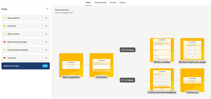 Messen Sie die Kundenzufriedenheit, erhalten Sie offenes Feedback und sammeln Sie gleichzeitig Bewertungen mit einer einzigen Umfrage unter Ihrer Marke.